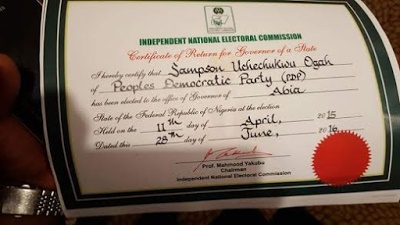 INEC issued certificate of return to PDP member, Uche Ogah , following an order by the Abuja Federal High Court on Monday June 27th, 2016, mandating INEC to immediately issue Certificate of Return to Ogah who came second at the PDP primaries in the state in 2014.