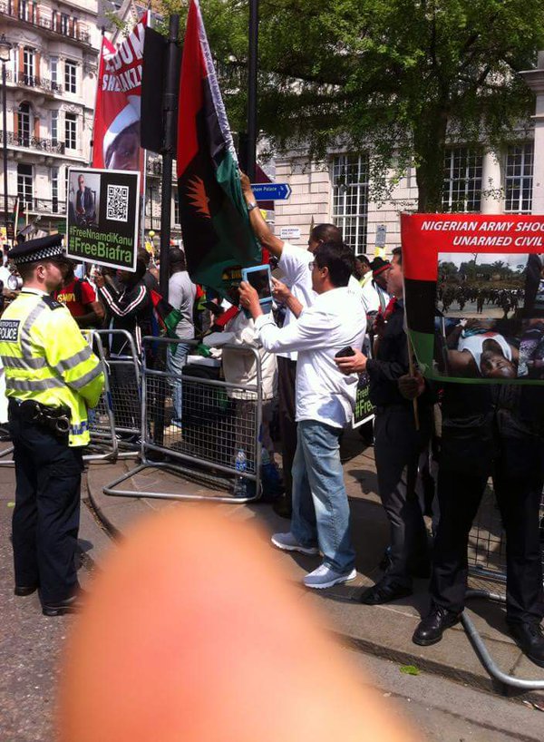 According to BBC Journalist Will Ross, who shared the picture, the Biafrans were arrested near Buckingham Palace, the official London residence and administrative headquarters of the reigning monarch of the United Kingdom.