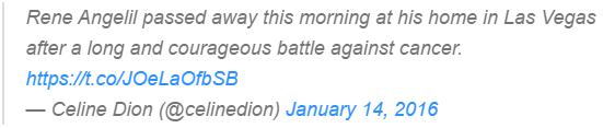 “René Angélil passed away this morning at his home in Las Vegas after a long and courageous battle against cancer,” his rep said in a statement on Thursday. “The family requests that their privacy be respected at the moment; more details will be provided at a later time.”