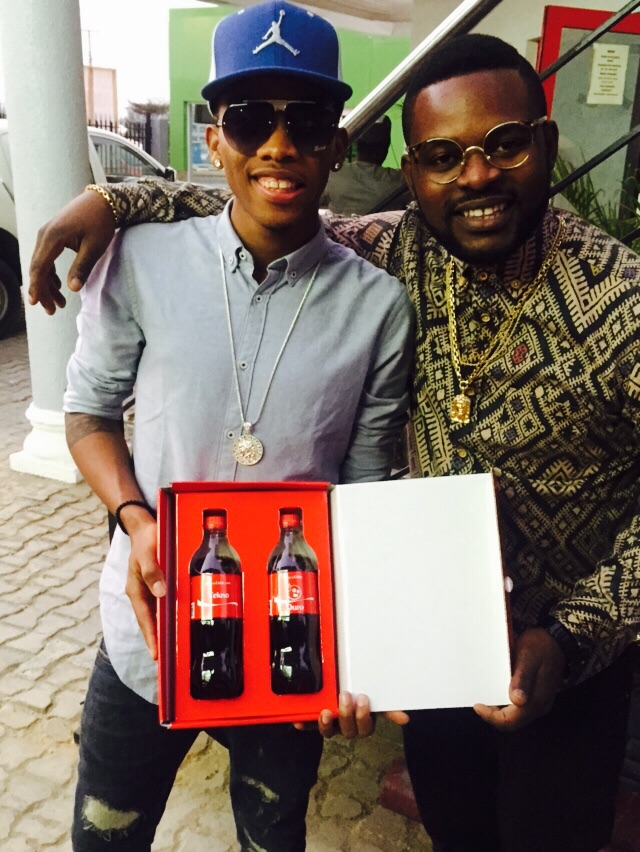 Ice Prince Zamani receiving his Customised Bottles of Coca-Cola from Share A Coke Wave II Host, Falz the Badt Guy |