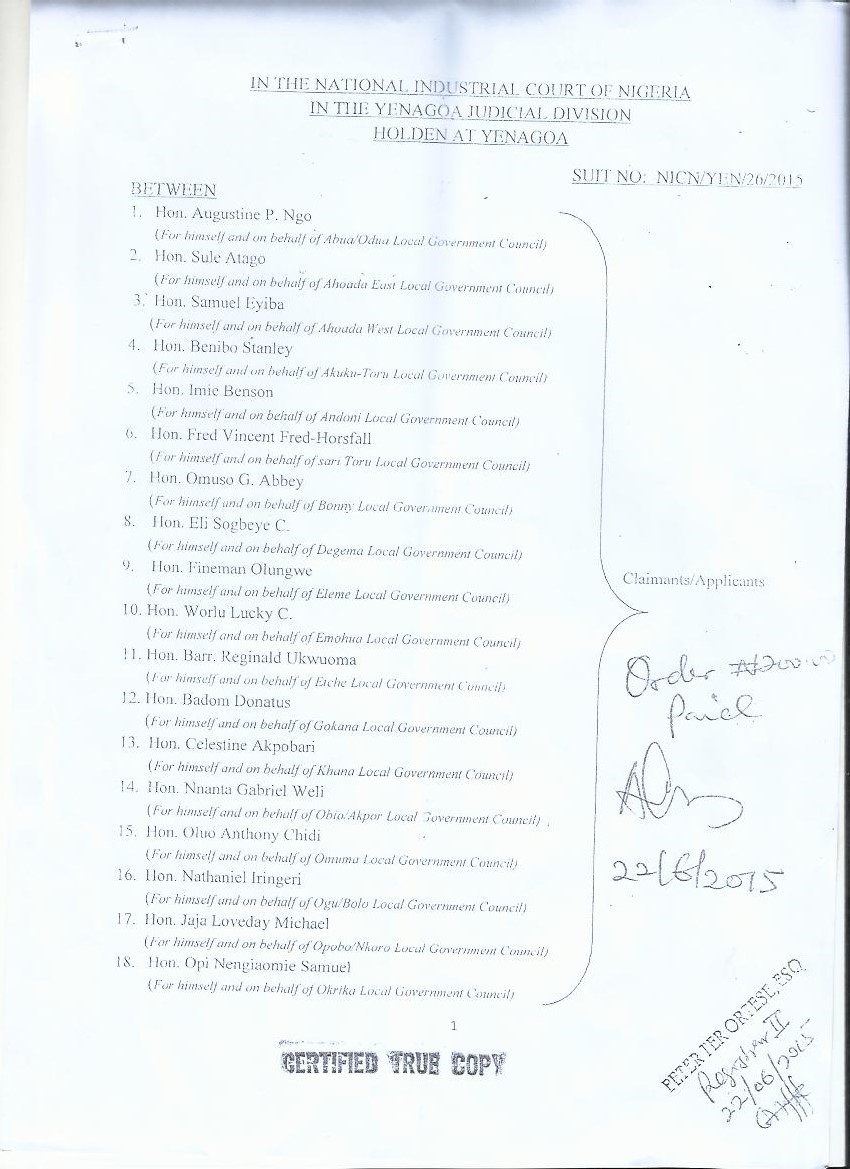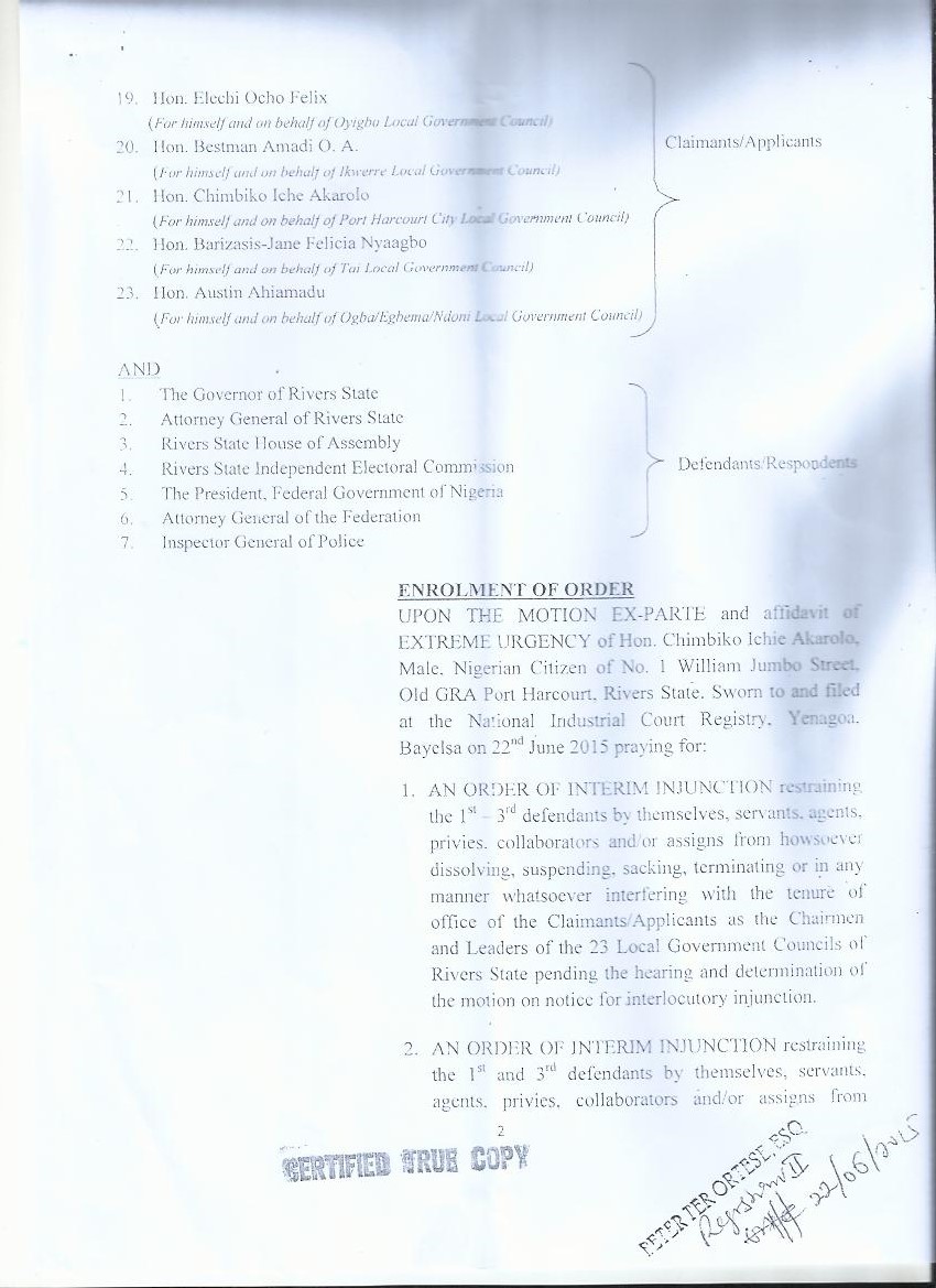 The Order, in Suit No: NICN/YEN/26/2015, which was granted on Monday, 22nd June, 2015 followed a motion ex-parte and affidavit of extreme urgency filed by the 23 Local Government Council Chairmen on behalf of themselves and the 23 Local Government Councils of Rivers State.