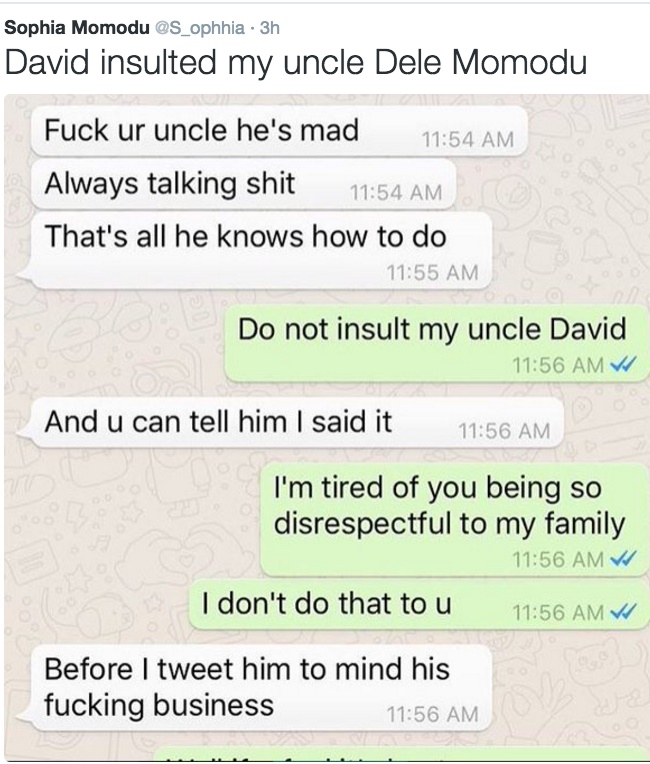 In a series of tweets, she revealed how Davido was disrespectful to her and her family and how he often insulted her uncle, Dele Momodu.