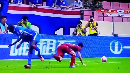 The challenge from Xiang was clumsy but not sinister and the Shenhua frontman comes into difficulty when his studs get caught in the ground as he body twists towards the turf.