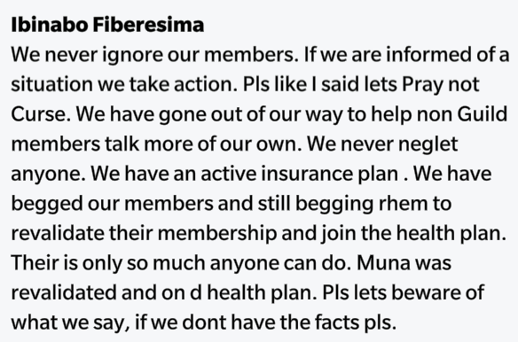 Fiberesima said “We never ignore our members. If we are informed of a situation we take action. Pls like I said lets Pray not Curse. We have gone out of our way to help non Guild members talk more of our own. We never neglet anyone. We have an active insurance plan . We have begged our members and still begging them to revalidate their membership and join the health plan. Their is only so much anyone can do. Muna was revalidated and on d health plan. Pls lets beware of what we say, if we dont have the facts pls.”