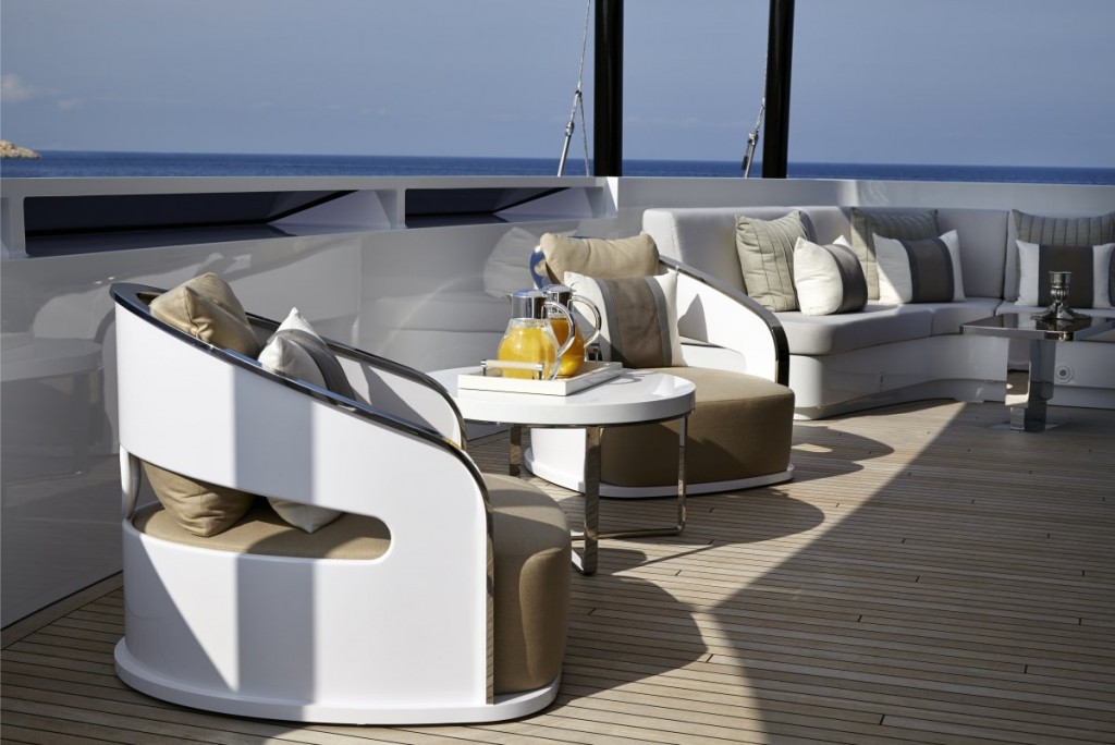 The yacht can house up to 12 guests and contains a full-beam master suite, an upper-deck VIP cabin, and four further double cabins.