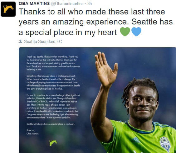 Martins, who has been with Seattle Sounders since 2013, posted a goodbye message on Twitter confirming his departure to join Shanghai Shenhua, saying it is time for a “new challenge”.
