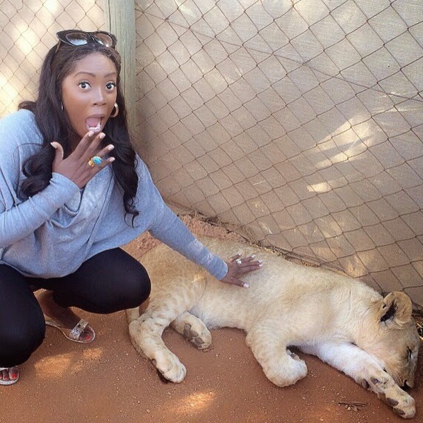 Pregnant Nigerian music star Tiwa Savage who is in South Africa has posted a picture of her goofing around a lion cub.