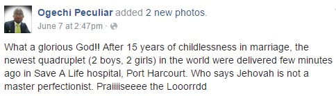 “What a glorious God!! After 15 years of childlessness in marriage, the newest quadruplet (2 boys, 2 girls) in the world were delivered few minutes ago in Save A Life hospital, Port Harcourt. Who says Jehovah is not a master perfectionist. Praiiiiseeee the Looorrdd”