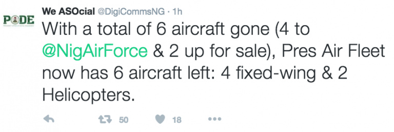 According to the Presidency Office of Digital Engagement (PODE): “6 aircraft are gone (4 to Nigerian AirForce and 2 up for sale). President Air Fleet now has 6 aircraft left: 4 fixed-wing and 2 Helicopters.”