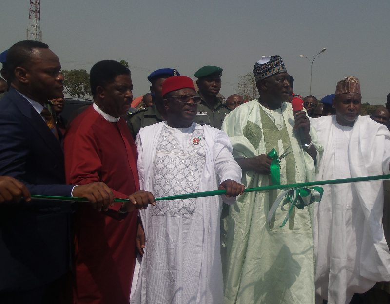 Governor David Umahi of Ebonyi State (centre); Secretary to the Government of the Federation, Engr. Babachir David Lawal (2nd right); Deputy Governor of Ebonyi State, Kelechi Igwe (left); Former Governor of Ebonyi State, Sen. Dr. Sam O. Egwu (2nd left); and Minister of State, Labour and Employment, Barr. James Ocholi, at the official visit/ formal commissioning of CBN road at the Centenary City, Abakaliki. Photo: EBSG