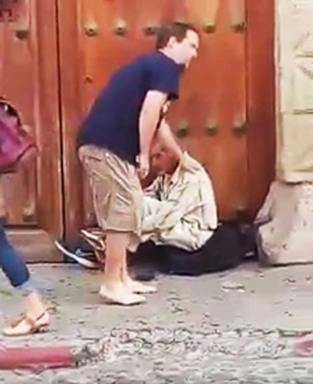 The touching moment a tourist took off his shoes and gave them to a homeless man before walking away barefoot was captured by a bystander.