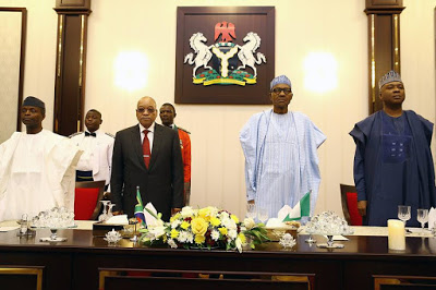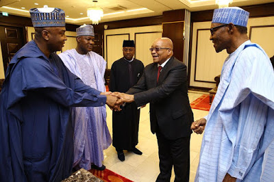 President Buhari was with President Jacob Zuma, Asiwaju Bola Ahmed Tinubu, Vice President Yemi Osinbajo, Alhaji Atiku Abubakar Senate President Bukola Saraki, Speaker Yakubu Dogara and Governor Bindow Jibrilla of Adamawa State as President Buhari hosts his South African counterpart Jacob Zuma to a State Banquet at the Presidential Banquet Hall on 8th Mar 2016.