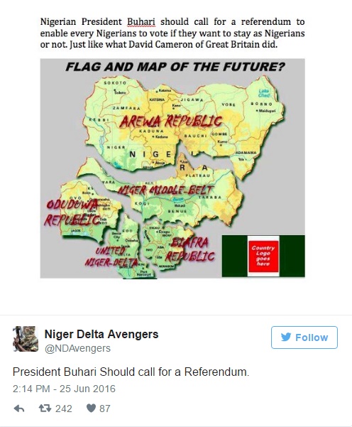 Niger Delta Avengers (NDA) has said that President Muhammadu Buhari should ‘borrow a leaf from British Prime Minister David Cameron and call for a referendum to enable Nigerians vote if they want to stay as Nigerians or not.’