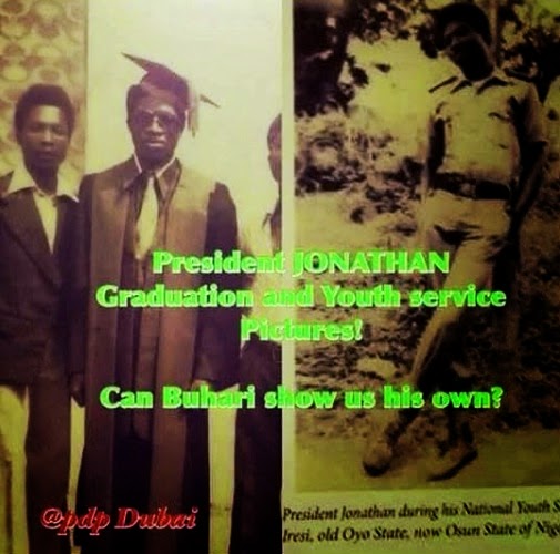 President Jonathan’s graduation and National Youth Service Corps (NYSC) pictures surfaced online on Friday. PDP wants to see pictures of Buhari’s graduation day and youth services period.