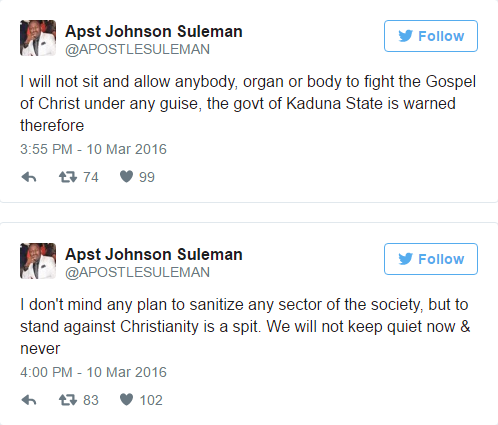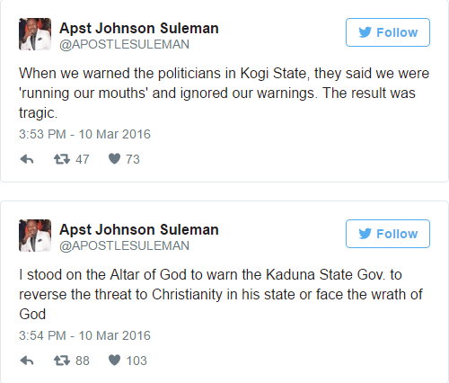 Apostle Johnson Suleiman, the president of Omega Fire Ministries, who predicted the death of the minister of state for labour, James Ocholi, issued a warning to the Kaduna state government.