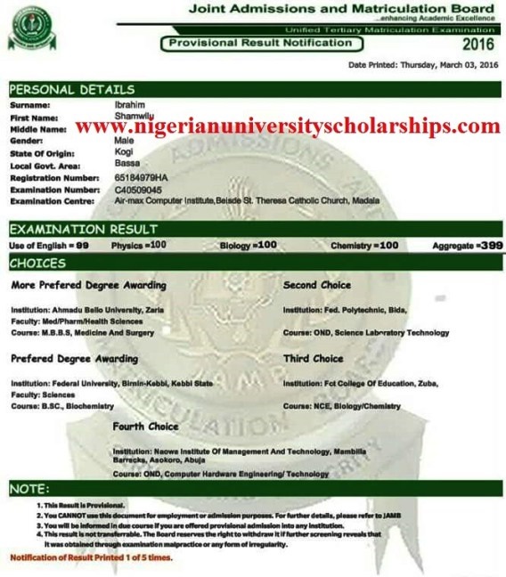 Nigerian University Scholarships, a website that advertises academic opportunities, says it is in possession of the Unified Tertiary Matriculation Examination (UTME) result of a “genius” from Kogi state who scored 399 marks out of a maximum obtainable 400.