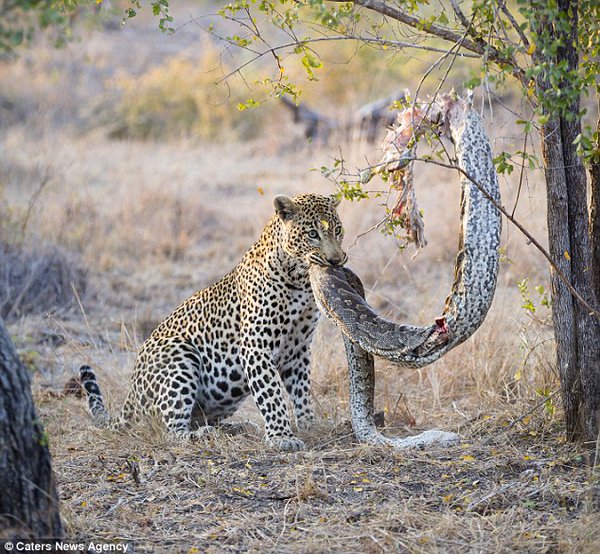 This hungry leopard thought it had come across the lunch of its life when it found a dead python |