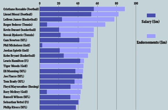 Ronaldo struck a £38.5million-a-year salary with Spanish giants Real Madrid. Plus his endorsement deals with Nike, watchmaker Tag Heuer and nutrition supplements group Herbalife were worth £22million.