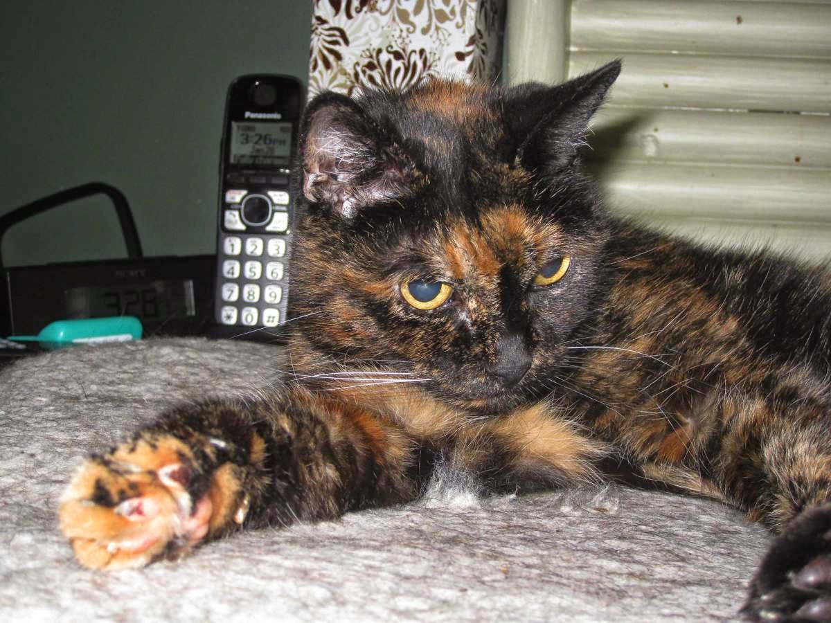The orange-and-black tortoiseshell spends her days sleeping in the middle of the staircase at her home in San Diego, Calif., where she lives with two other cats, 9 and 10 years old respectively.